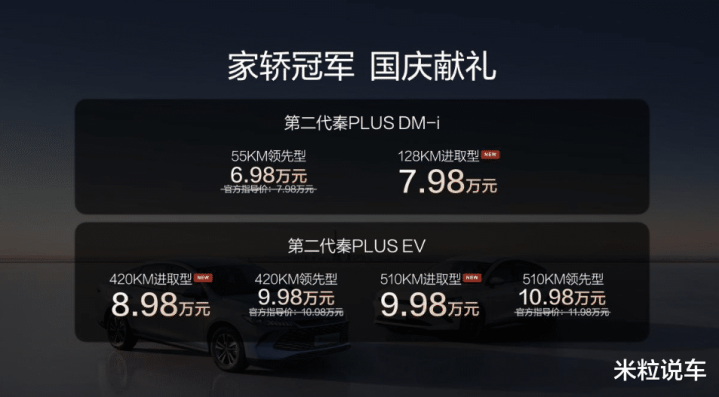 在近期秦PLUS推新了,新增128KM续航版配置,价格你很难猜中,仅仅只有7.98万!要知道去年7.98万买55KM,今年同价换128KM纯电续航的!同样价格让超长纯电续航“猛增加”,比亚迪你还能再卷些吗?更关键的是,比亚迪还推出更多新款,居然6.98万就能买到入门款,同样搭载5代超级混动!